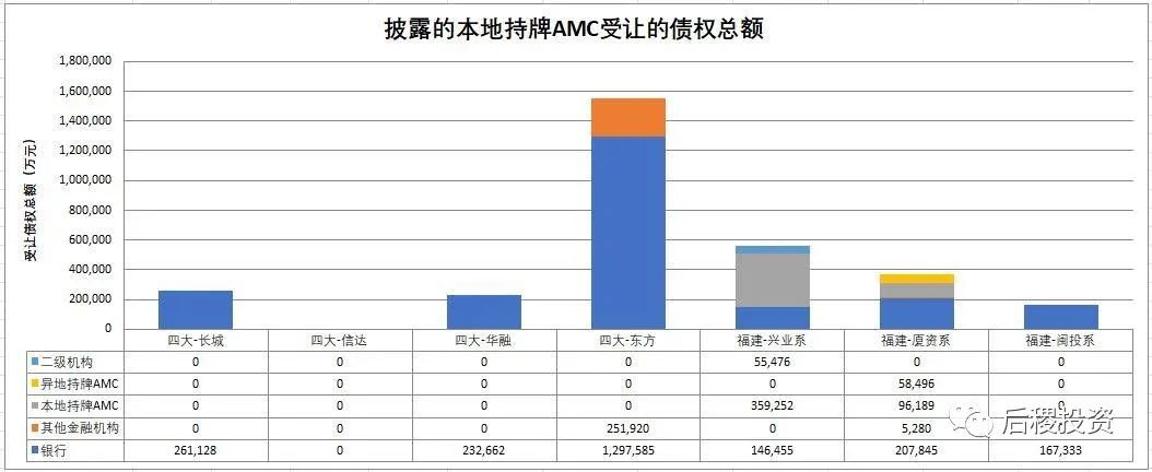 單從債權總額上看,東方的受讓規模遙遙領先,信達則因為不披露金額造成數據缺失。本地地方AMC的受讓總規模中,有一大部分都是來自本地其他AMC(主要是東方)。
