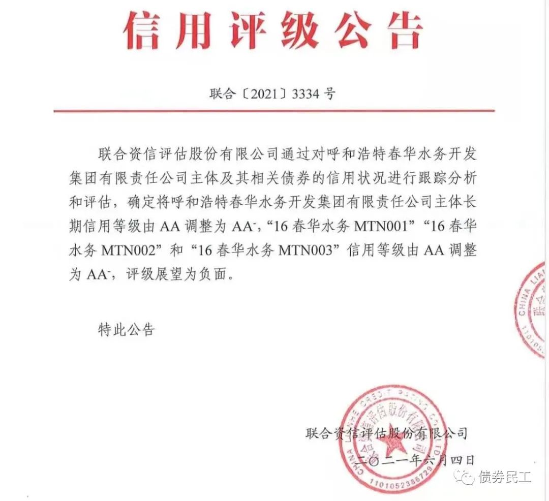 在此之前的2021年5月7日,聯合資信評估股份有限公司披露了《關于呼和浩特春華水務開發集團有限責任公司部分債務逾期的關注公告》,將會持續跟蹤債務逾期事項對公司帶來的影響,但并未下調春華水務的主體信用評級。