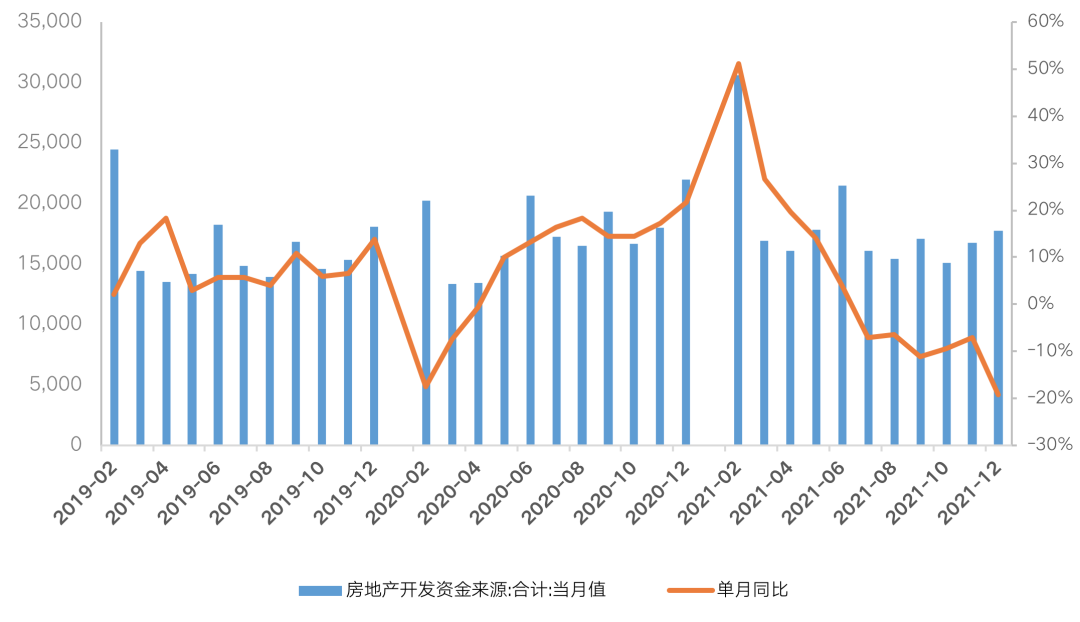 從房地產(chǎn)開發(fā)到位資金來看,2021年1-12月,房地產(chǎn)開發(fā)企業(yè)到位資金201132億元,同比增長4.2%,規(guī)模創(chuàng)歷史新高,但增速創(chuàng)近六年新低。且增速逐月下滑,下半年起到位資金單月值同比出現(xiàn)負(fù)增長,9月同比降幅達(dá)到11.2%。四季度政策密集發(fā)聲后,但年末到位資金增速仍表現(xiàn)不佳,12月單月到位資金17770億元,同比下降19.3%,單月到位資金規(guī)模低于歷史同期,同比增速創(chuàng)近五年新低。
