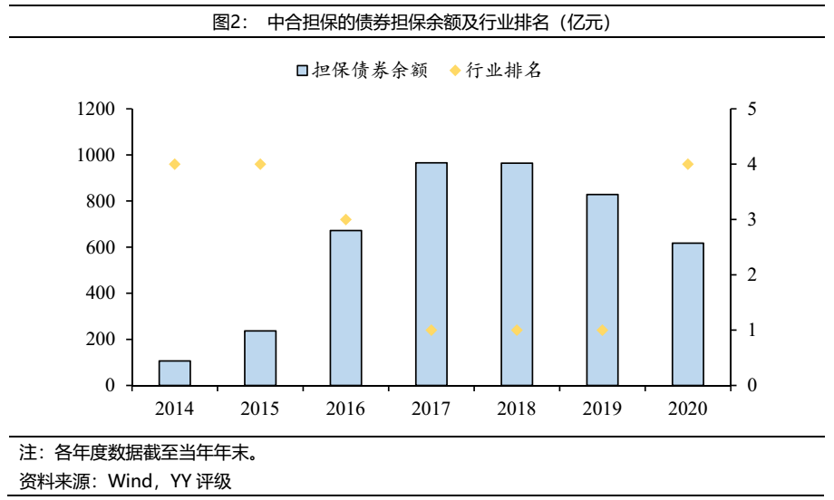 債券擔保一直是中合擔保的核心業務,也曾輝煌一時,但隨著政策的變化,中合擔保的債券擔保業務也不得不開始減速。中合擔保在2012年成立,2014年時其擔保債券余額便居于行業第四名,2017-2019年其債券擔保余額連續三年位居行業首位,最高時在保余額超過1000億元。但是自融資擔保新規出臺之后,擔保公司展業受到一定限制,其業務開始逐漸減速,截至2020年末,其債券擔保余額縮減至617.42億元。擔保業務的收縮使得公司保費收入下降明顯,沖擊利潤。2019年公司保費收入是7.4億,而2020年公司僅實現保費收入5.8億,同比下降1.6億,沖擊公司利潤表現。