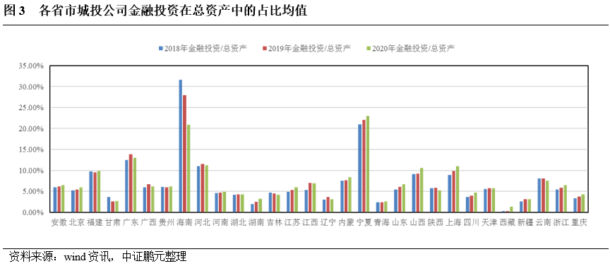 (3)從區域來看,城投公司在金融投資上的分化較為明顯。北京、天津、上海、廣東、海南、寧夏等地的城投公司表現得最活躍,河北、山西、山東、廣西、云南等地的城投公司處于第二梯隊,安徽、江蘇、浙江、重慶、陜西、江西等地的城投公司活躍度一般,河南、湖北、湖南、青海、新疆、西藏等地的城投公司活躍度很低(見圖2)。總體來看,城投公司金融投資的活躍度與其所屬區域的金融發展水平以及城投公司的數量多寡、資信水平、轉型深度等密切相關。部分區域的經濟財政實力、金融發展水平較高,但由于轄區內城投公司數量較多且資信水平層次不齊,故在金融投資上的平均水平被拉低,如江蘇、浙江;部分區域的經濟財政實力、金融發展水平一般,但轄區內僅有幾家核心城投公司且資信水平均較高,故在金融投資上的平均水平被推高,如海南、寧夏(見圖3)。