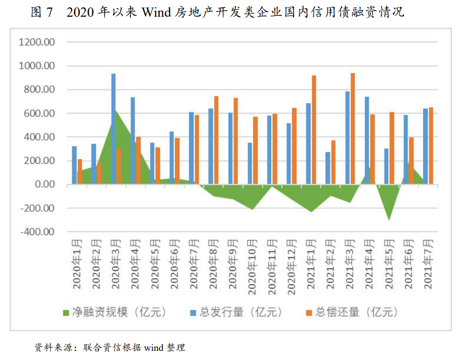 在房地產融資監管持續高壓及地產違約事件頻發下,投資者風險偏好下行,發行規模增速明顯放緩,凈融資規模走弱。具體來看,2021年1-7月房地產開發類企業信用債發行總量4005.56億元,同比增長7.63%,增速明顯放緩;考慮到償還規模4492.93億元,實際融資規模偏低;分月份看,3月和4月是集中融資月份,占上半年融資總額的45.27%,與往年走勢基本一致;受“三條紅線”影響,2021年1-7月,房企國內債券凈融資規模為負。