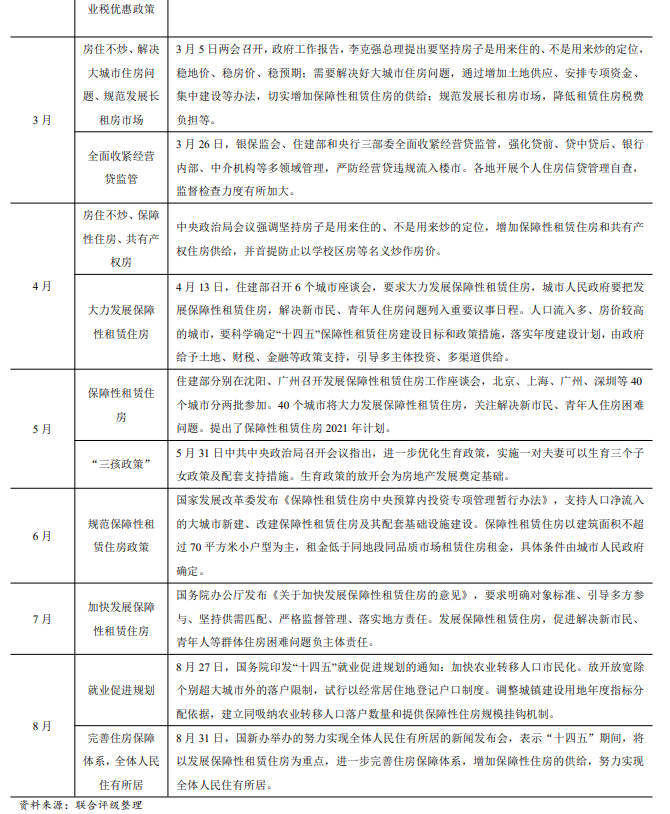 與此同時,在嚴格執行“房住不炒、因城施策”的政策大環境下,新型城鎮化、住房保障體系建設作為重點持續被強調。3月5日,李克強總理作政府工作報告,提出通過增加土地供應、安排專項資金、集中建設等辦法,切實增加保障性租賃住房和共有產權住房供給。此后,住建部4月召開6個城市座談會,要求各地增加土地、財稅、金融等政策支持,切實增加保障性租賃住房供給;7月,國務院發布《加快發展保障性租賃住房的意見》,要求從土地、審批流程、資金、稅費等多方面支持保障性租賃住房建設。8月31日,國新辦舉辦的努力實現全體人民住有所居的新聞發布會,表示“十四五”期間,將以發展保障性租賃住房為重點,進一步完善住房保障體系,增加保障性住房的供給,努力實現全體人民住有所居。