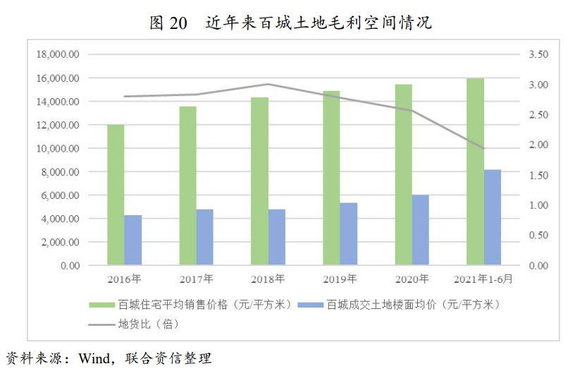 近年來,房企毛利率整體呈下降態勢,尤其隨著2017年前后高價地項目結轉,2020年行業整體毛利率下降愈發明顯,僅從拿地均價及房價對比趨勢角度來看,房企遠期真實盈利能力仍不容樂觀。