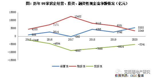 從歷年99家房企的現(xiàn)金流情況來看,2017年為主要轉(zhuǎn)折點(diǎn)。2017年融資性現(xiàn)金流凈額達(dá)到峰值12402億元,同時投資性現(xiàn)金流凈額為歷年最高,為凈流出9087億元,證明整體房地產(chǎn)行業(yè)依靠融資來驅(qū)動投資,對融資依賴度較高。