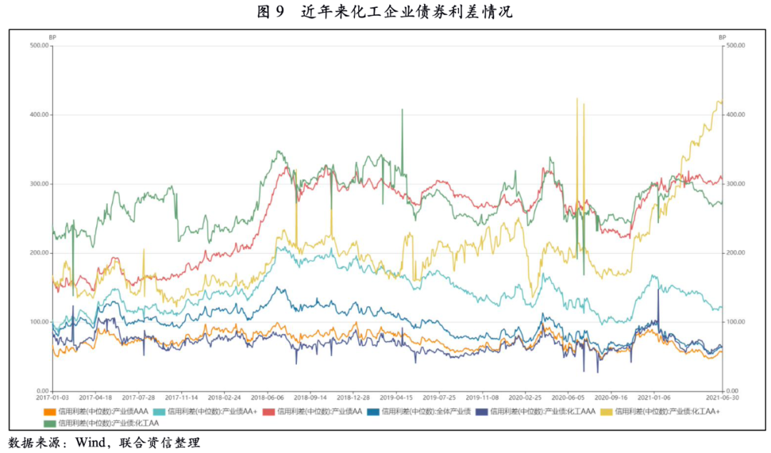 2021年下半年,隨著新冠肺炎疫苗接種人數(shù)的增加,全球疫情防控形勢持續(xù)向好,將帶動相關(guān)化工原材料需求的增加,預(yù)計原油價格將在60~80美元/桶區(qū)間震蕩,對多數(shù)化工品價格有一定支撐,企業(yè)高盈利水平有望延續(xù)。此外,“雙碳”目標(biāo)下,石油化工、煤化工等細(xì)分領(lǐng)域?qū)⒓哟舐浜螽a(chǎn)能淘汰力度,實現(xiàn)行業(yè)內(nèi)結(jié)構(gòu)性調(diào)整,煉油、化肥、純堿、氯堿等細(xì)分行業(yè)將控制產(chǎn)能總量,傳統(tǒng)產(chǎn)業(yè)裝置開工率將穩(wěn)步提高,有利于相關(guān)領(lǐng)域龍頭企業(yè)的發(fā)展,預(yù)計化工行業(yè)景氣度仍將處于較高水平。下半年,化工企業(yè)債券到期規(guī)模同比下降,到期債券的主體評級以AAA為主,在國內(nèi)貨幣政策大概率保持穩(wěn)健的前提下,化工行業(yè)整體信用風(fēng)險可控。
