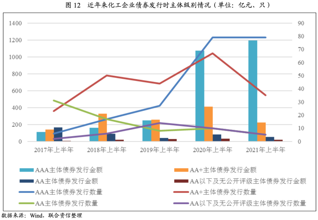 從相關(guān)債券發(fā)行時級別分布看,2021年上半年化工企業(yè)發(fā)行的124只信用債券發(fā)行時主體級別仍以AA+和AAA為主,AAA級別主體發(fā)行的信用債數(shù)量占比保持了近年來的逐年上升趨勢。截至2021年6月底,化工企業(yè)發(fā)行信用債券中,AAA級別主體信用債數(shù)量占比為63.71%,同比提高16.12個百分點,較非AAA主體債券發(fā)行數(shù)量優(yōu)勢進(jìn)一步擴(kuò)大。AA及以下級別、無公開評級的主體債券發(fā)行數(shù)量占比合計未超過10%。上述情況反映了即使在當(dāng)前大多數(shù)化工企業(yè)效益明顯好轉(zhuǎn)的背景下,面對國內(nèi)和國際復(fù)雜多變的大環(huán)境,投資者對于高評級債項的偏好仍然未發(fā)生明顯變化。