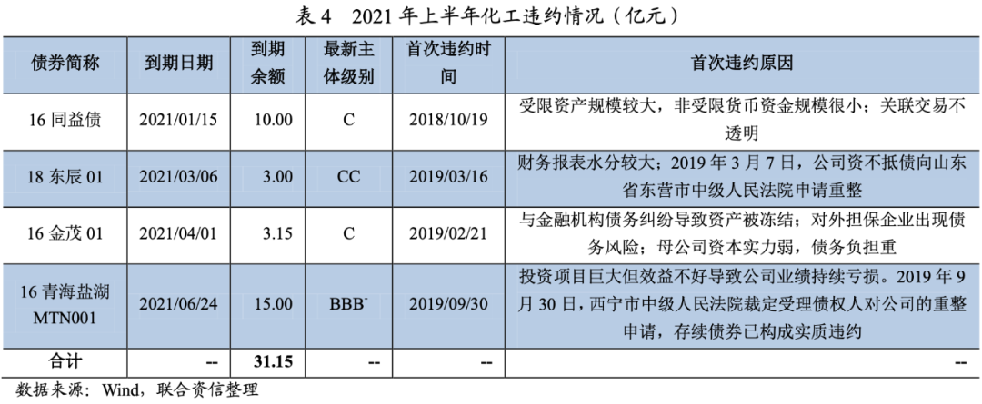 2021年上半年,化工行業(yè)無新增違約主體。新增到期違約債券主要系前期已違約主體無償付能力所致。2021年上半年,化工行業(yè)違約債券合計金額31.15億元,占上半年到期化工債券總額的3.04%,占六月末存續(xù)債券余額的0.87%,整體風(fēng)險可控。