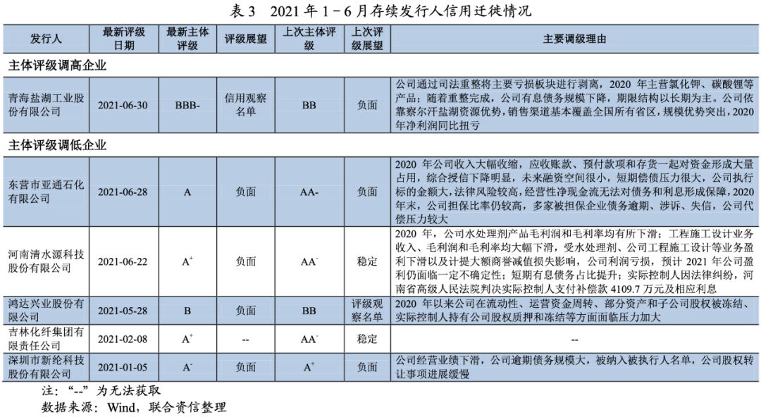 2021年1-6月,化工企業(yè)信用遷徙情況如下表所示,其中,評級上調(diào)的僅有青海鹽湖工業(yè)股份有限公司,主體評級由BB上調(diào)為BBB,評級上調(diào)主要基于其司法重整將主要虧損板塊剝離,財務(wù)狀況改善。評級下調(diào)的涉及5家,4家下調(diào)一個子級,1家下調(diào)兩個子級(深圳市新綸科技股份有限公司由A+下調(diào)為A-),評級下調(diào)因素主要涉及經(jīng)營業(yè)績下滑、流動性緊張、訴訟等因素。