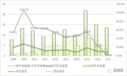 圖1.2008-2017年銀行理財凈增量、金融機構存款凈增量及增速