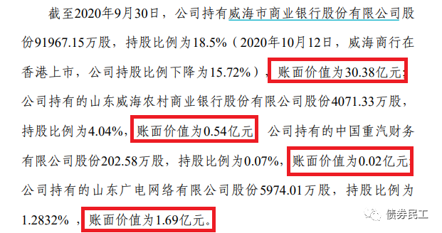 如果單純從賬面價值來說,擬劃入資產(chǎn)的價值大于擬劃出資產(chǎn)的價值。但是從股權(quán)的實際價值來看,銀行股權(quán)的實際價值應(yīng)該更高,對于發(fā)行人信用加持的作用更大。尤其是威海銀行為香港上市公司(股票代碼9677.HK)。