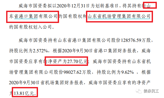 威海市國資委擬將其持有的山東省港口集團有限公司的國有股權(quán)(對應(yīng)凈資產(chǎn)為27.70億元)和山東省機場管理集團有限公司的國有股權(quán)(對應(yīng)凈資產(chǎn)為13.81億元)劃入公司,擬劃入股權(quán)對應(yīng)凈資產(chǎn)為41.51億元。