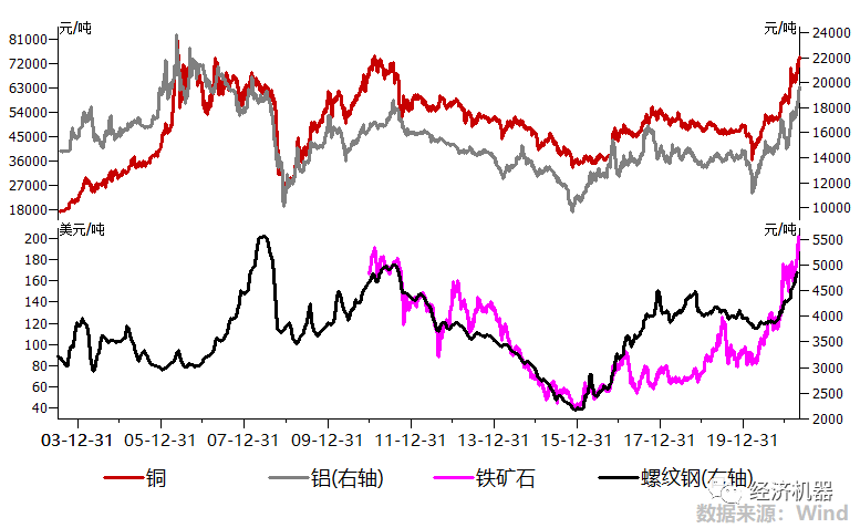 從大宗商品價格看,更是持續暴漲,近期紛紛創出近十年新高。倫銅突破1萬美元/噸;滬鋁突破19000元/噸,超過了2009年“四萬億”時期的高點;螺紋鋼價格突破5600元/噸,已經是歷史新高(圖2)。