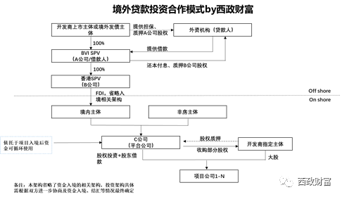 1.開發商上市主體或境外發債主體設立BVI SPV(即A公司)作為借款人;A公司設立全資B公司并通過外商投資方式最終與境內非房主體共同成立C公司作為平臺公司。