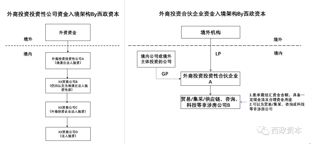 需注意的是,以通過搭建外商投資投資性合伙企業(yè)方式進(jìn)行資金入境時(shí)(見上述右圖),需注意下設(shè)的B公司需能承載結(jié)匯資金金額,比如需具有相應(yīng)的現(xiàn)金流;企業(yè)性質(zhì)可以為非投資性的貿(mào)易/集采/供應(yīng)鏈類的公司或咨詢、科技類等非涉房公司。