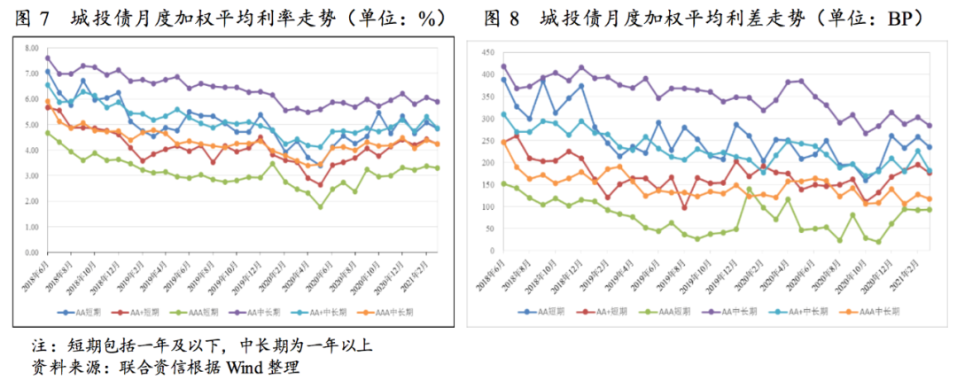 2020年下半年以來,隨著新冠肺炎疫情形勢趨穩,宏觀經濟穩步回升,貨幣政策逐步回歸常態化,資金面整體有所趨緊。2021年一季度,各級別、期限城投債的發行利率同比均有所上升。環比來看,各級別短期城投債的發行利率環比均小幅上升,各級別中長期城投債的發行利率均略有下降,主要是在春節前后時點因素以及央行公開市場大規模凈回籠影響下,2021年初市場流動性短暫趨緊、投資者期限偏好呈現分化所致。分月來看,1月,各級別、各期限城投債的發行利率相對較低,且環比均有所下降,其中AA級中長期、AA+級中長期和AAA級中長期分別環比下降0.41個、0.44個和0.41個百分點,整體拉低了一季度各級別中長期城投債發行利率的平均水平;2月,各級別、各期限城投債的發行利率均明顯上升;3月,各級別、期限城投債的平均發行利率環比均有所下降,但整體小幅高于1月的平均水平。一季度,各級別、期限城投債發行利率呈現先上升后下降的“倒V”形態。