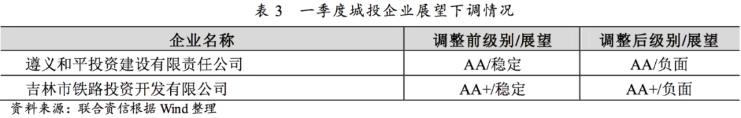 一季度,城投企業主體級別無調降的情況。評級展望由穩定調整為負面的城投企業2家,貴州省和吉林省各1家,展望下調原因主要包括區域融資環境較差、企業自身流動性壓力較大、新增不良信貸記錄等。