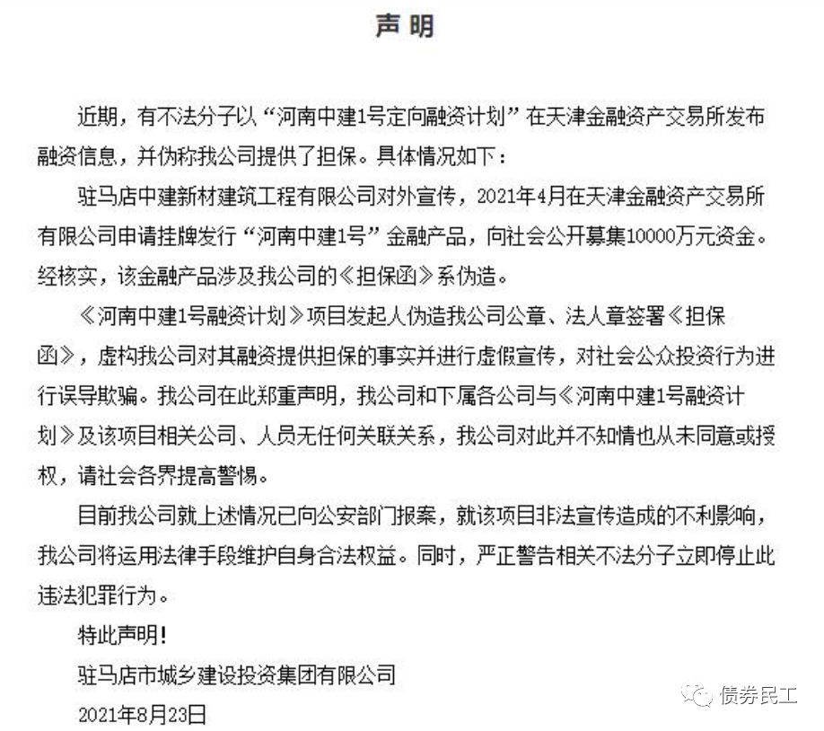 2、2021年8月23日,駐馬店市城鄉(xiāng)建設(shè)投資集團有限公司發(fā)布聲明表示,有不法分子以“河南中建1號定向融資計劃”在天津金融資產(chǎn)交易所發(fā)布定融產(chǎn)品信息,偽造了公司的擔(dān)保函。