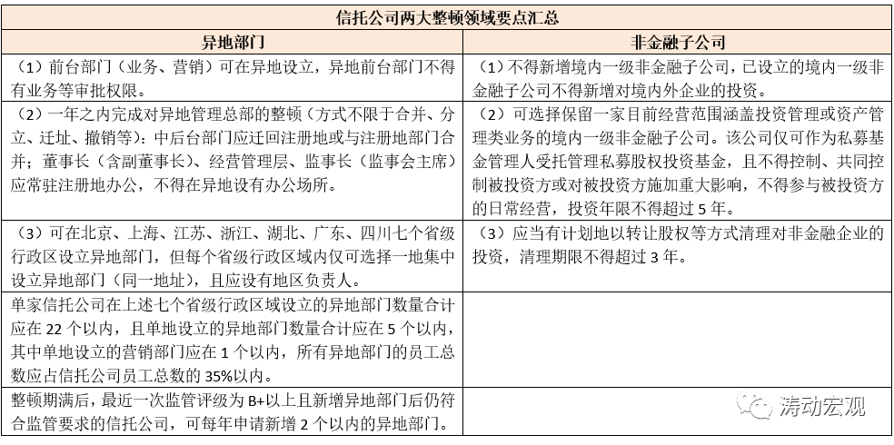 目前對信托公司的清理整頓也在進行中,具體可參照兩份文件,即2021年7月30日銀保監會發布的《關于清理規范信托公司非金融子公司業務的通知》(銀保監辦發〔2021〕85號)和9月28日銀保監會發布的《關于整頓信托公司異地部門有關事項的通知(征求意見稿)》,明確對信托公司的非金融公司和異地部門進行清理整頓,相關要點見下表: