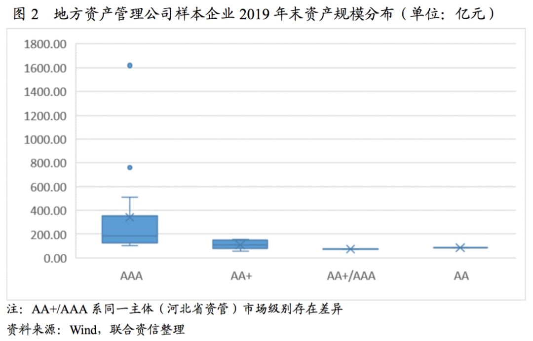 從樣本企業資產規模來看,截至2019年末,主體AAA級別資產規模最大值1619.19億元、最小值106.74億元、平均值379.69億元;AA+級別企業中,資產規模最大值154.39億元,最小值57.08億元;存在級別差異的河北省資管,其資產規模為74.21億元;AA級別僅有一家企業,其資產規模為86.34億元,高于AA+級別最小值。