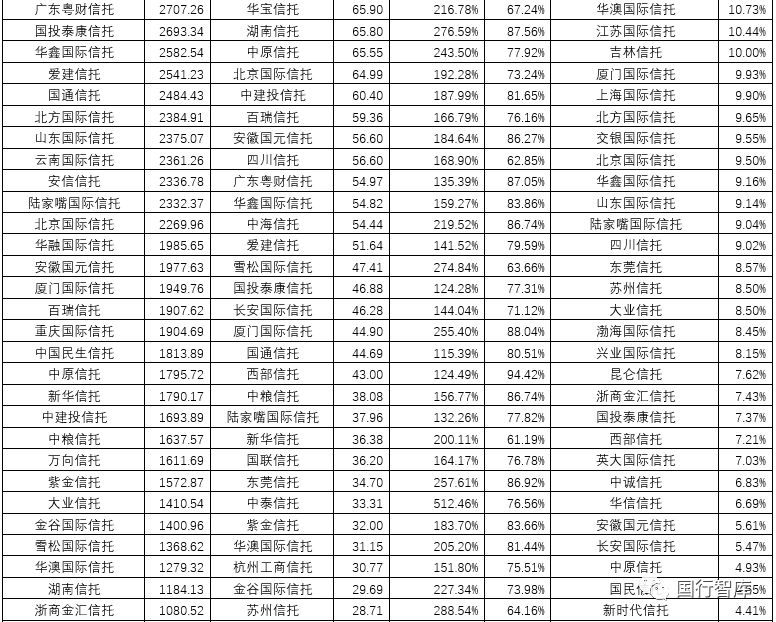4、當(dāng)然也有一些信托公司的業(yè)績出現(xiàn)了明顯改善,如中糧信托(同比481.06%)、國聯(lián)信托(360.93%)、新華信托(241.30%)、西藏信托(70.01%)、英大信托(66.66%)、國投泰康信托(63.77%)、國民信托(54.90%)、陸家嘴信托(45.98%)、長安信托(42.58%)、萬向信托(38.59%)等等。