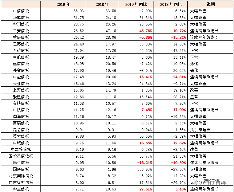 3、平安信托、重慶信托、中融信托、中鐵信托、中誠信托、民生信托、華寶信托、四川信托、中原信托、北方信托、金谷信托、華信信托、華融信托等13家信托公司2018年與2019年連續(xù)兩年的凈利潤均出現(xiàn)下降。