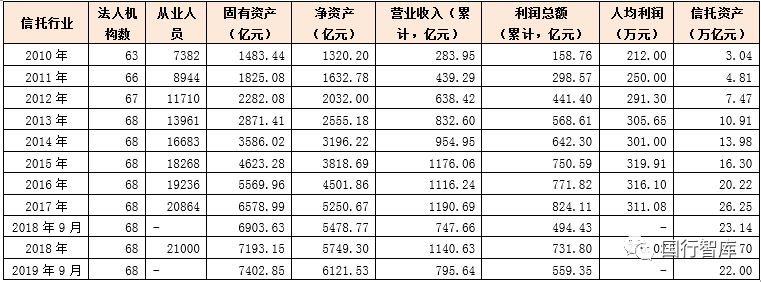 (1)2013年以來,我國信托法人機(jī)構(gòu)數(shù)量便一直穩(wěn)定在68家,從業(yè)人數(shù)超過2.10萬人,人均利潤達(dá)到300萬元左右。