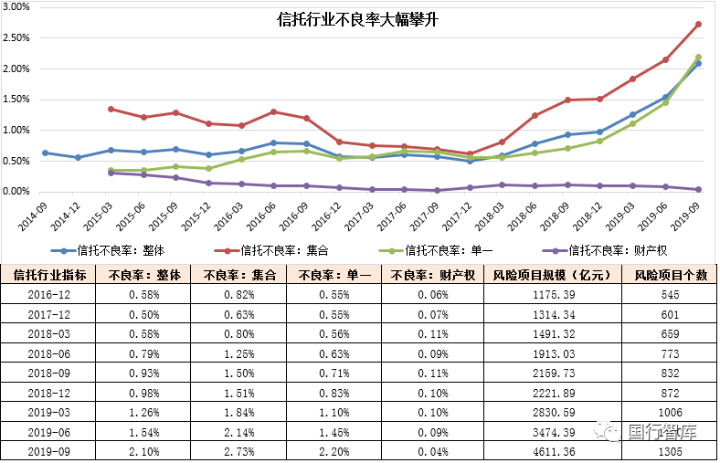 具體來看,截至2019年9月底,集合類信托、單一類信托和財(cái)產(chǎn)權(quán)信托的不良率分別為2.73%、2.20%和0.04%,特別是集合類信托和單一類信托的不良率分別較2019年6月底上升0.59個(gè)百分點(diǎn)和0.75個(gè)百分點(diǎn),項(xiàng)目質(zhì)量惡化趨勢(shì)非常明顯。