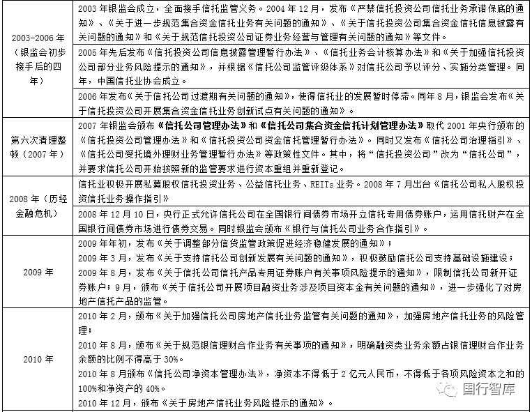 2003年銀監(jiān)會(huì)接手信托公司的監(jiān)管權(quán)后,開始重塑監(jiān)管架構(gòu)。2004年12月,發(fā)布《嚴(yán)禁信托投資公司信托業(yè)務(wù)承諾保底的通知》、《關(guān)于進(jìn)一步規(guī)范集合資金信托業(yè)務(wù)有關(guān)問題的通知》、《關(guān)于信托投資公司集合資金信托信息披露有關(guān)問題的通知》和《關(guān)于規(guī)范信托投資公司證券業(yè)務(wù)經(jīng)營與管理有關(guān)問題的通知》等文件。