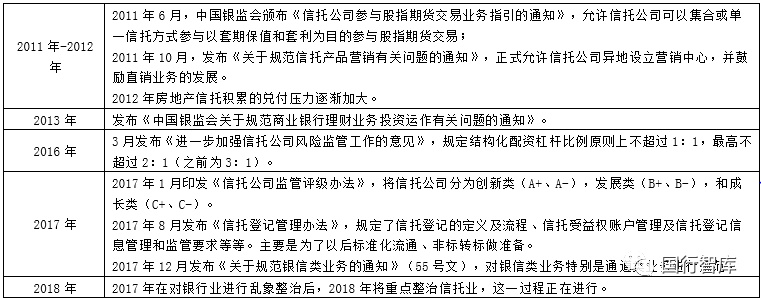 2007年銀監(jiān)會(huì)發(fā)布《信托公司管理辦法》和《信托公司集合資金信托計(jì)劃管理辦法》正式取代2001年央行頒布的《信托投資公司管理辦法》和《信托投資公司資金信托管理暫行辦法》。同時(shí)又發(fā)布《信托公司治理指引》、《信托公司受托境外理財(cái)業(yè)務(wù)管理暫行辦法》等政策性文件。這一時(shí)期銀監(jiān)會(huì)將“信托投資公司”改為“信托公司”新兩規(guī),使信托公司的業(yè)務(wù)發(fā)展逐步邁入相對(duì)正軌的階段。