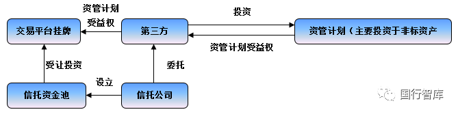 該模式主要有信托公司委托第三方去投資一個(gè)底層資產(chǎn)為非標(biāo)的資管計(jì)劃(同時(shí)再設(shè)立一個(gè)信托資金池),隨后第三方將上述資管計(jì)劃受益權(quán)在北金所、銀登等交易平臺(tái)掛牌,最后信托公司通過信托資金池去摘牌。考慮到該模式由于是通過協(xié)議轉(zhuǎn)讓的方式完成對(duì)接,因此呈現(xiàn)沒有流動(dòng)性、價(jià)值不公允以及底層資產(chǎn)不清晰等特征,仍然屬于資金池業(yè)務(wù)。