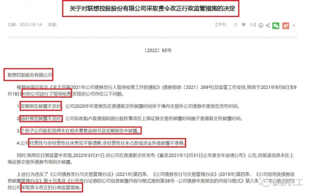 根據(jù)北京證監(jiān)局官方網(wǎng)站2022年4月14日披露的信息,聯(lián)想控股股份有限公司(以下簡(jiǎn)稱(chēng)“聯(lián)想控股”)被采取責(zé)令改正行政監(jiān)管措施,主要原因是定期報(bào)告披露不及時(shí)、臨時(shí)報(bào)告披露不及時(shí)、經(jīng)營(yíng)性與非經(jīng)營(yíng)性往來(lái)界定不夠清晰等。