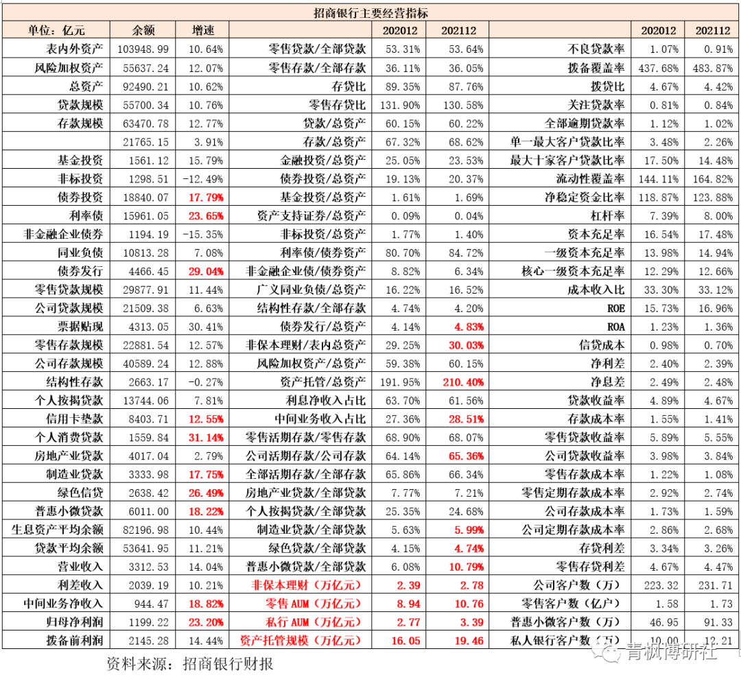 5、再以投行業務中的并購融資(聚焦優質上市公司、優質國企)、撮合類業務(利用招投星系統和招投星小程序為資產找資金)和企業財富管理產品日均余額為例,儼然已經成為招行的主要投行業務品牌。例如,2021年全年并購融資業務發生額達到2036.36億元(同比大幅增長28.53%);撮合類業務融資規模達到3076.29億元(同比大幅增長40.65%);企業財富管理產品日均余額達到4252.86億元(同比大幅增長19.09%)。