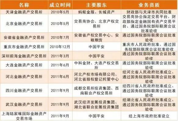 2010-2011年間,全國范圍內出現了7家金交所,包括:安徽省金融資產交易所、重慶市金融資產交易所、深圳前海資產交易所、大連金融資產交易所、河北金融資產交易所、四川金融資產交易所和武漢金融資產交易所,全都通過了國務院清理整頓各類交易場所部際聯席會議驗收。