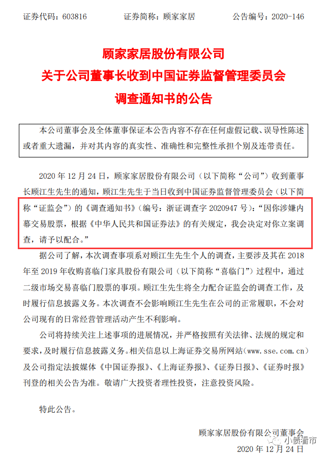 12月24日,顧家家居(603816.SH)公告稱,因涉嫌內幕交易股票,董事長顧江生收到中國證券監督管理委員會調查通知書 。