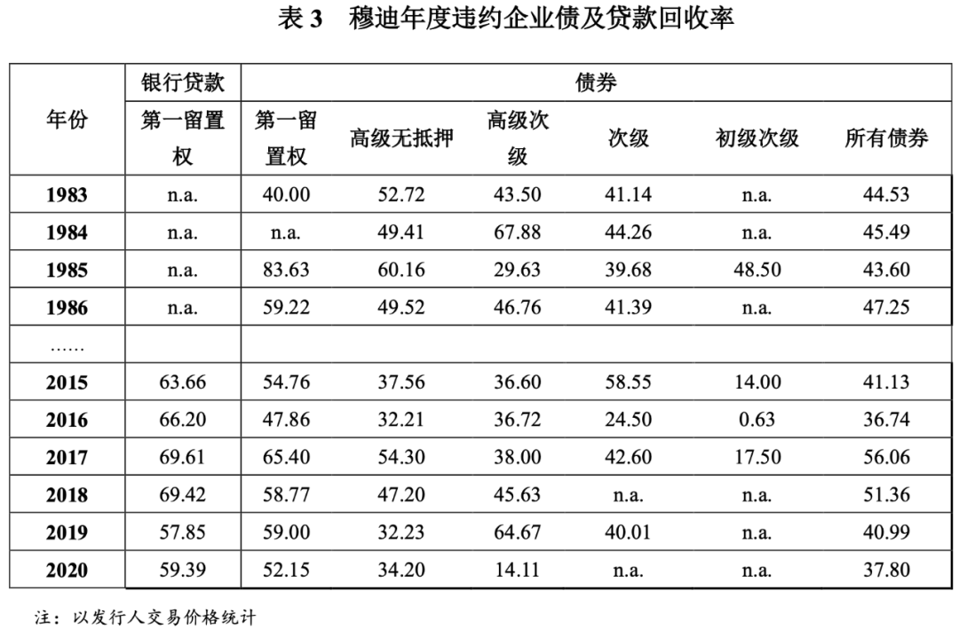 此外,報(bào)告附件中還列示了從1983年以來(lái)違約企業(yè)債及貸款的年度回收率水平。以2020年度報(bào)告為例(詳見表3),2020年基于交易價(jià)格的高級(jí)無(wú)抵押債券的回收率水平為34.20%。