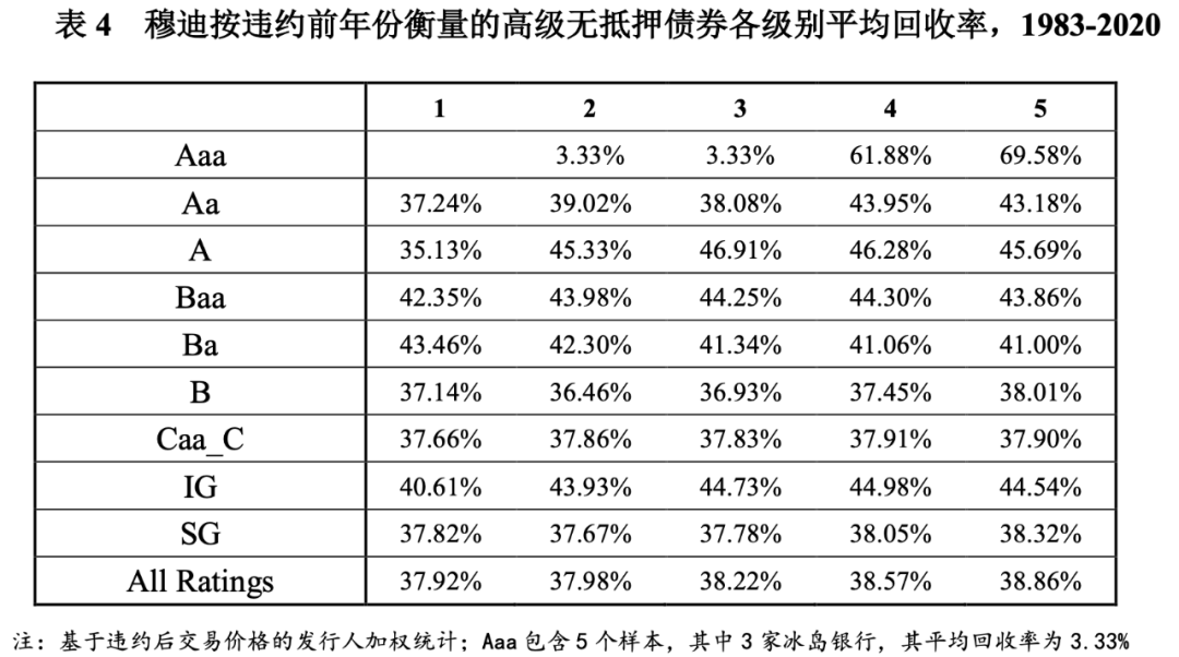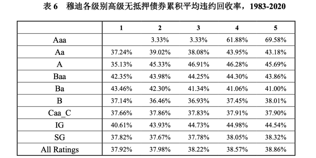 根據(jù)穆迪公開資料顯示,平均違約回收率是指特定信用級(jí)別的債務(wù)工具多年期平均違約回收水平。以2020年度報(bào)告為例,表4列出高級(jí)無(wú)抵押債券在違約前一年至前五年對(duì)應(yīng)的信用級(jí)別的平均回收率,違約前2年為B級(jí)別的平均回收率為36.46%,是指違約兩年前為B級(jí)的高級(jí)無(wú)抵押債券在兩年內(nèi)一定時(shí)間的平均回收率水平為36.46%。