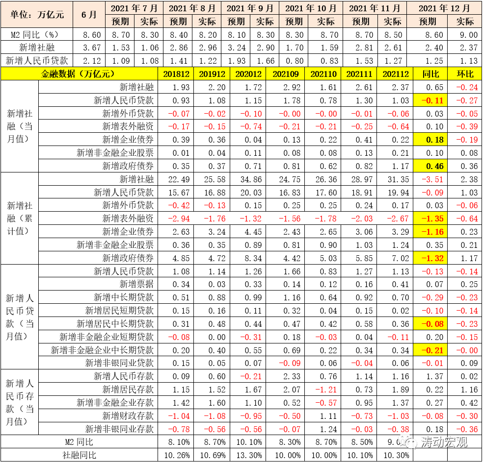 2021年12月,M2同比增速高達9%,較前值和預期值分別高出0.50個百分點和0.40個百分點,社融增速環比上升0.20個百分點至10.30%。但是12月當月新增社融與新增信貸數據繼續低于預期,實際值分別較預期值0.03個萬億元和0.12萬億元,延續著11月實際值低于預期值的態勢,表明經濟基本面并不樂觀,目前市場信心依然不足,宏觀政策層面需要更有作為來穩預期、穩信心。