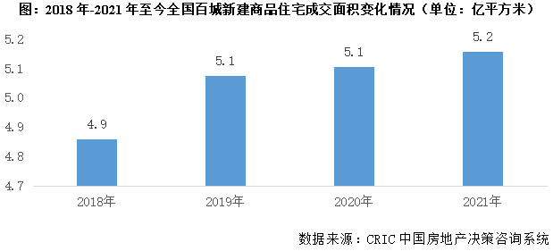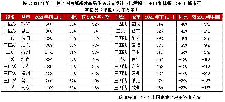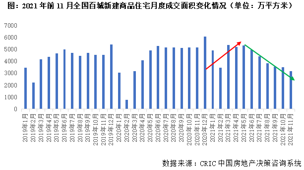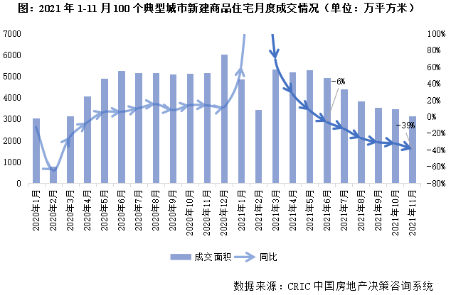 CRIC數據統計顯示,全國100個典型城市2021年前11月商品住宅成交面積合計47529萬平方米,同比增1%。