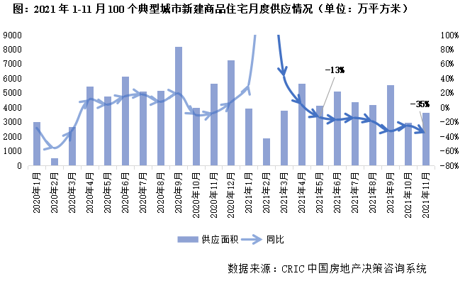 據CRIC統計,2021年前11月全國100個重點城市商品住宅新增供應面積45233萬平方米,相較2020年和2019年均同比下降11%。受新開工萎靡影響全年新房供應規模縮減至近三年低點。