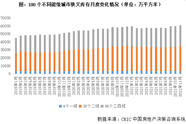 從100個典型城市庫存水平變化來看,基本延續波動上行趨勢,1月顯著跳減后,2-8月狹義庫存量維持在5.8萬平方米持續波動,此后伴隨信貸收緊,熱點城市加碼政策持續發酵,疊加前期需求釋放殆盡,市場行情急轉直下,“金九銀十”爽約,整體成交增長動力減弱,導致庫存顯著跳增,9-11月狹義庫存量持續上行,至11月末已達6.1億平方米。