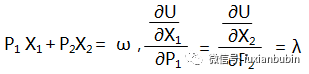 每增加一個單位商品或勞務,消費者心理上會感到增加的滿足或效用越來越小。即隨著商品和勞務消費量的增加,總效用遞減的速度不斷增加。所以,在給定商品消費組合的情況下,一種商品消費數量固定不變,另一種商品消費數量不斷增加,則隨著另一種商品消費量的增加,該商品的邊際效用遞減。由此,消費者效用最大化的商品組合,要實現消費者在花費在各種商品上的最后一元錢所帶來的邊際效用相等(即購買的各種商品的邊際效用與價格之比相等),最后等于每一元貨幣帶來的邊際效用(λ,0<λ<1)。給定消費者消費預算ω的情況下,對價格分別為P1和P2的商品X1和X2的消費組合為: