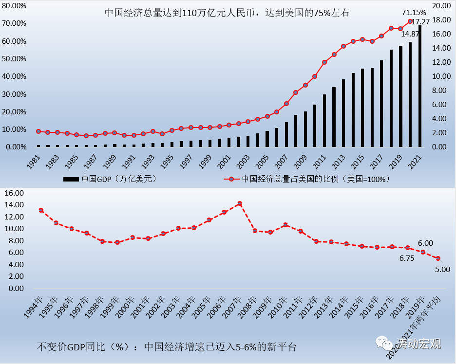 2021年12月11日,中財辦韓文秀副主任指出2021年中國經(jīng)濟(jì)總量將達(dá)到110萬億元人民幣(按照6.37的匯率測算約為17.27萬億美元),相當(dāng)于美國經(jīng)濟(jì)總量的75%左右,較2020年經(jīng)濟(jì)總量突破100萬億元人民幣又進(jìn)了一步。