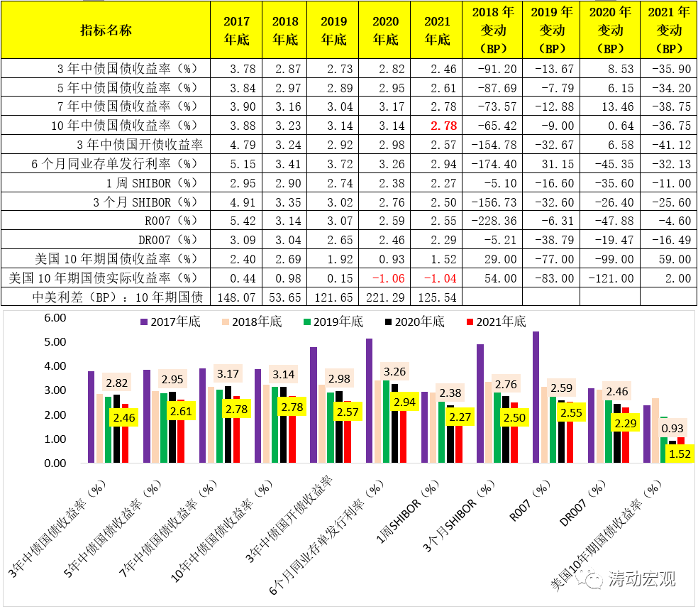 如果不考慮2020年的特殊年份,則中國債市自2018年起已連續(xù)牛了四年。以10年期中國國債收益率為例,2018年下行65.42BP、2019年下行9BP、2020年微幅上揚(yáng)0.64BP、2021年下行36.75BP,也即2018年以來已累計110BP,而10年期國債收益率亦已降至2.80%以下,中美利差相應(yīng)收窄至120-130BP之間。