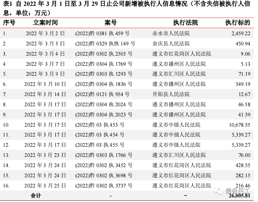 根據評級公司2022年3月31日披露的公告信息,某城投公司2022年3月1日至29日,共新增16條被執行新信息,合計被執行金額為2.60億元。需要關注的是,這些被執行人信息中不包含失信被執行人信息,如果計算上次數會更多。