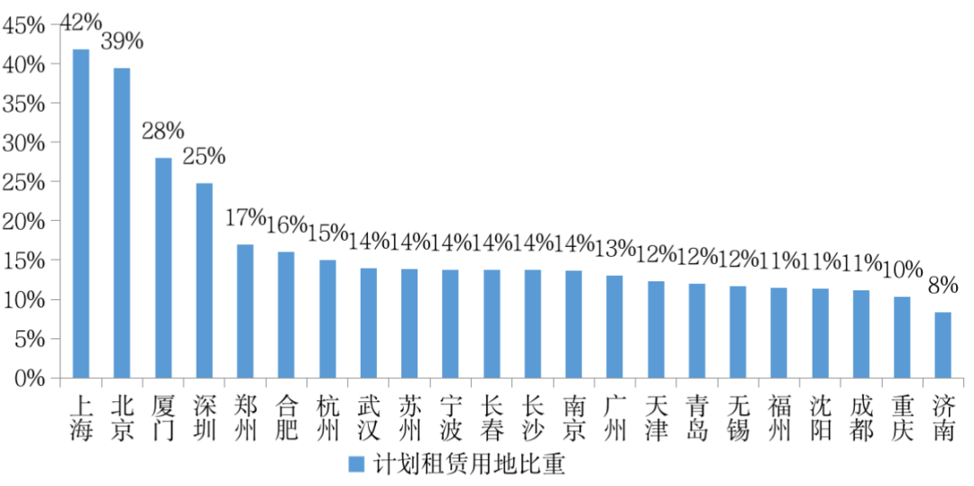 圖:22個(gè)重點(diǎn)城市計(jì)劃租賃宅地供應(yīng)占商品住宅計(jì)劃供應(yīng)比例