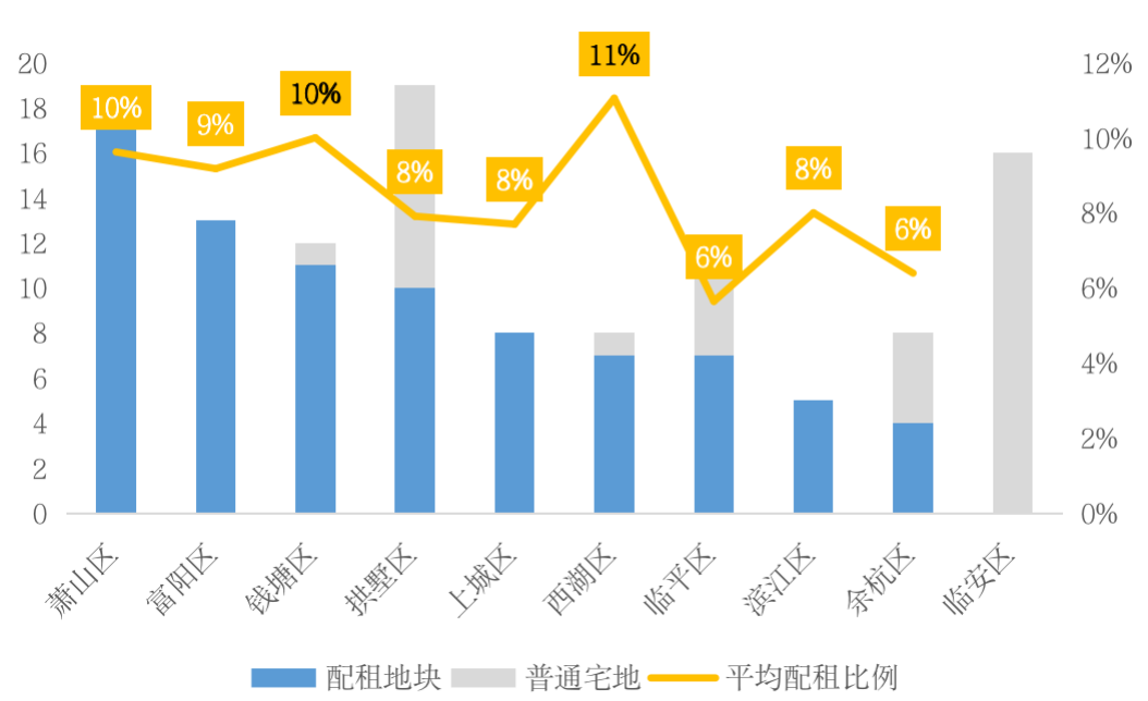 核心板塊優(yōu)質(zhì)宅地深度捆綁配建也是杭州租賃供應(yīng)的典型特征。杭州市區(qū)中除臨安外,其余區(qū)域的出讓地塊大部分均有配建公租房要求,其中富陽(yáng)、上城、濱江等區(qū)域出讓地塊更是全部要求配建公租房。