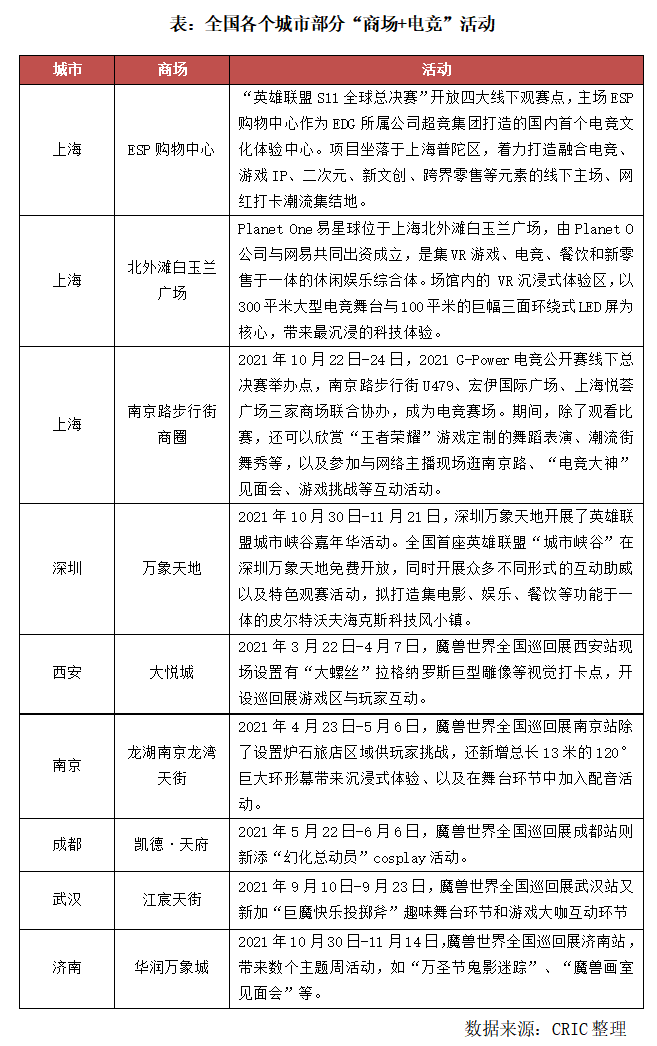 2021年,上海開(kāi)設(shè)了第一家以電競(jìng)為主題的購(gòu)物中心—ESP購(gòu)物中心,結(jié)合電競(jìng)IP該中心引進(jìn)全國(guó)首家王者榮耀職業(yè)聯(lián)賽5000平米專業(yè)賽館,預(yù)計(jì)每年舉辦超過(guò)350場(chǎng)比賽,全年線上曝光人次超200億。此外,區(qū)別于傳統(tǒng)的快閃模式,ESP購(gòu)物中心不僅僅是在特定時(shí)期內(nèi)與商場(chǎng)合作形成短期流量,而是融合了虛擬游戲、餐飲、聯(lián)名零售等一系列潮玩,精準(zhǔn)對(duì)標(biāo)不同客群的需求。