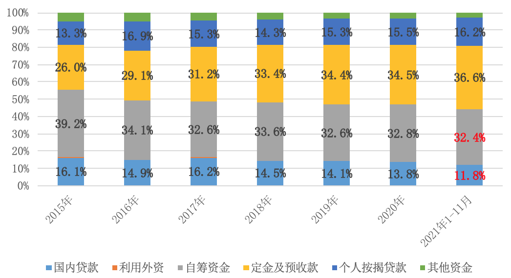 據(jù)統(tǒng)計(jì)數(shù)據(jù)顯示,2021年1-11月,房地產(chǎn)開發(fā)企業(yè)到位資金183362億元,同比增長7.2%。其中,國內(nèi)貸款、自籌資金占比分別跌至11.8%和32.4%,較2020年末分別減少2個(gè)百分點(diǎn)和0.4個(gè)百分點(diǎn)。反觀定金及預(yù)收款、個(gè)人按揭貸款占比分別升至36.6%和16.2%,較2020年末分別增加2.2個(gè)百分點(diǎn)和0.6個(gè)百分點(diǎn)。說明國內(nèi)貸款、自籌資金增長顯著受限,定金及預(yù)收款、個(gè)人按揭貸款漸成房企最為重要的資金渠道來源,企業(yè)對(duì)銷售回款的依賴度持續(xù)提升。