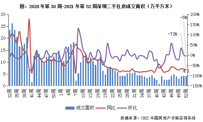 2021年第52周,深圳二手房成交4.1萬平方米,環比回落5%,同比下降72%。二季度以來深圳市場調控層層加碼抑制市場熱度,二手房市場長期低位震蕩,在當前政策環境下后市難有突破,大概率持續低位震蕩。